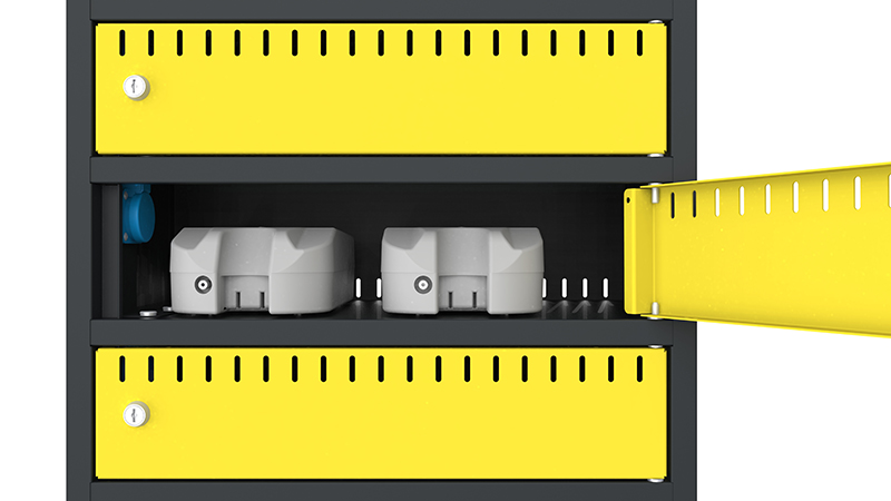 Wymontowanej baterii nie trzeba trzymać w domu, dzięki naszej szafie bezpiecznie i szybko można ją naładować m.in. w garażu, w podziemnym parkingu lub innym zadaszonym miejscu. W skrytkach mogą być przechowywane dowolne akumulatory (z wyjątkiem kwasowo-ołowiowych lub innych emitujących szkodliwe opary). Szafa do ładowania akumulatorów to doskonałe rozwiązanie do ładowania wielu akumulatorów jednocześnie m.in. w wypożyczalniach, serwisach, sklepach z elektrycznymi rowerami lub stacjach ładowania akumulatorów.