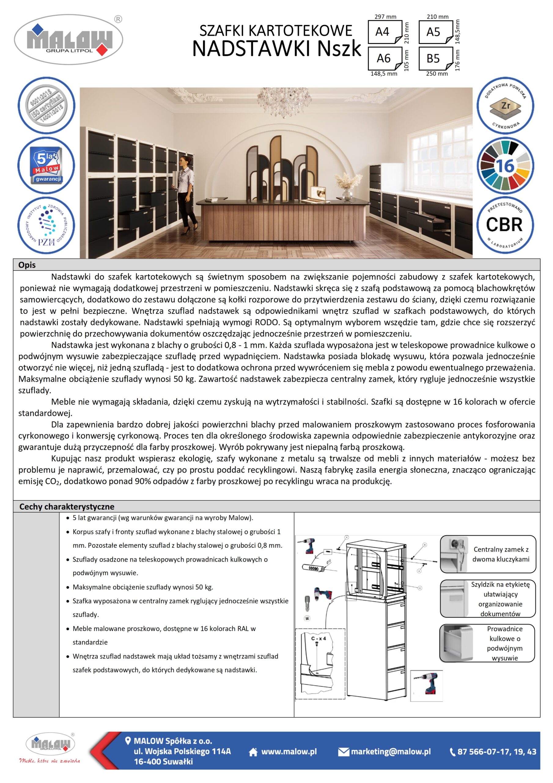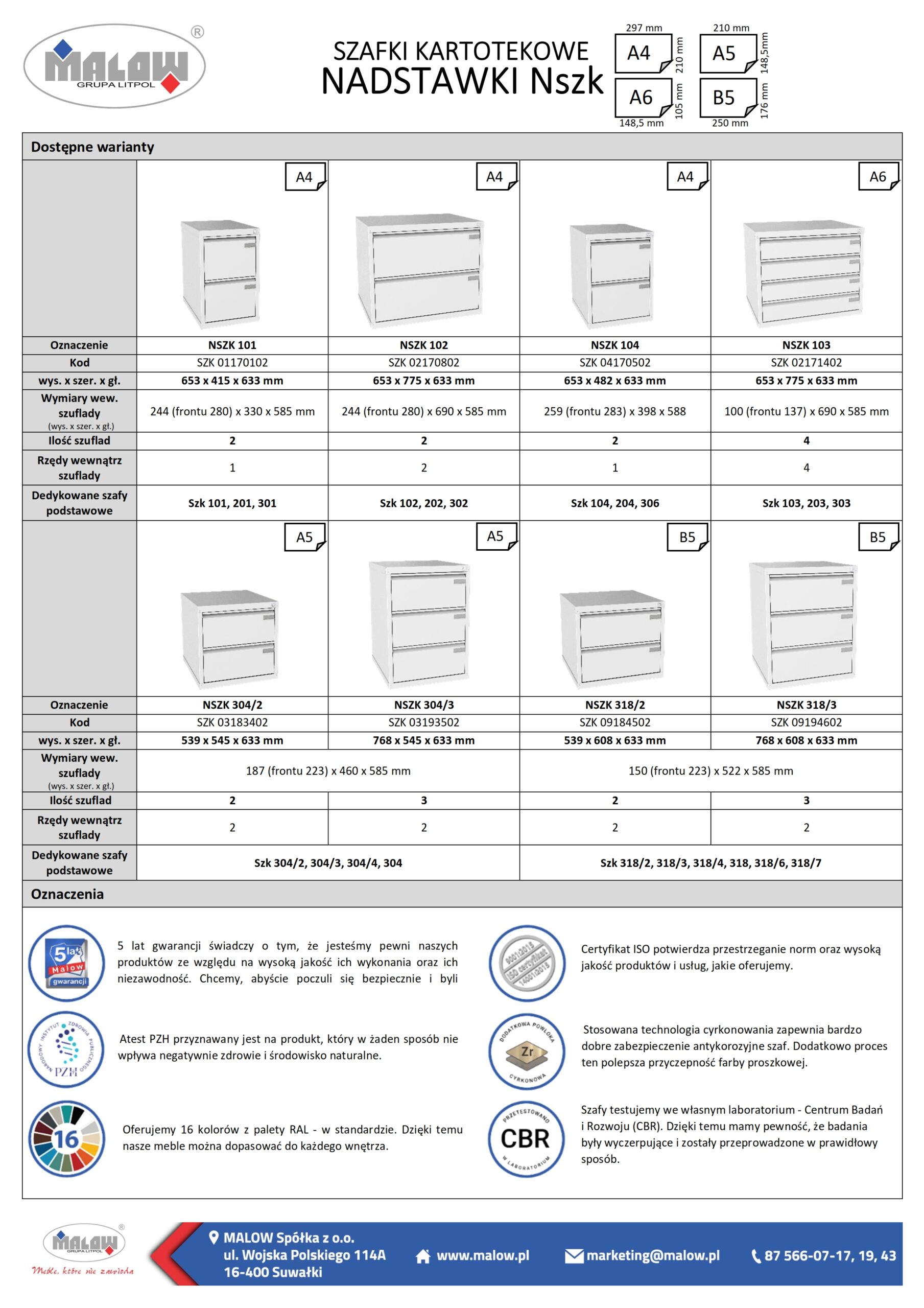 Odpowiedzią Malowa na tę sytuację są nadstawki NSZK na szafki kartotekowe SZK. Są świetnym sposobem na zwiększenie pojemności szaf kartotekowych, ponieważ nie wymagają dodatkowej przestrzeni w pomieszczeniu. Występują w wielu wariantach, więc łatwo dopasować je do istniejącej zabudowy z szafek kartotekowych. Piętrzące się góry dokumentów nie są problemem, gdy masz możliwość postawienia nadstawki na szafy kartotekowe. Szafki kartotekowe SZK i nadstawki NSZK są w stanie pomieścić dokumenty, które musisz przechowywać.