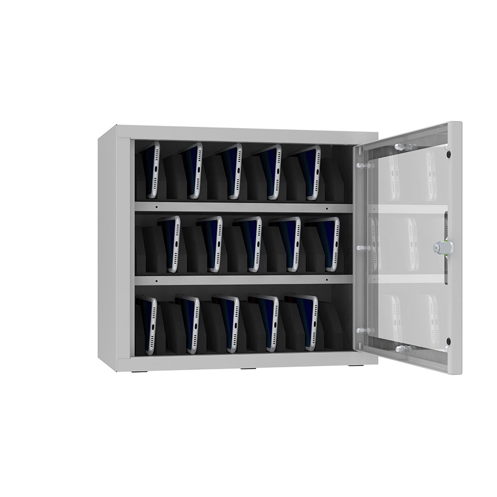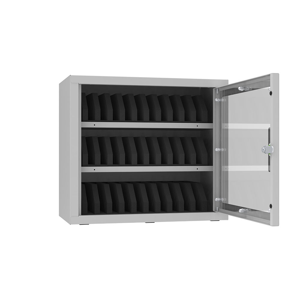 Szafka zawiera 30 miękkich przegród, co zapewnia stabilne i bezpieczne ułożenie telefonu. Uczniowie mogą mieć pewność, że ich urządzenia są bezpieczne. Nauczyciel natomiast czuje kontrolę, ponieważ urządzenia są schowane w szafce, do której klucz ma tylko on.