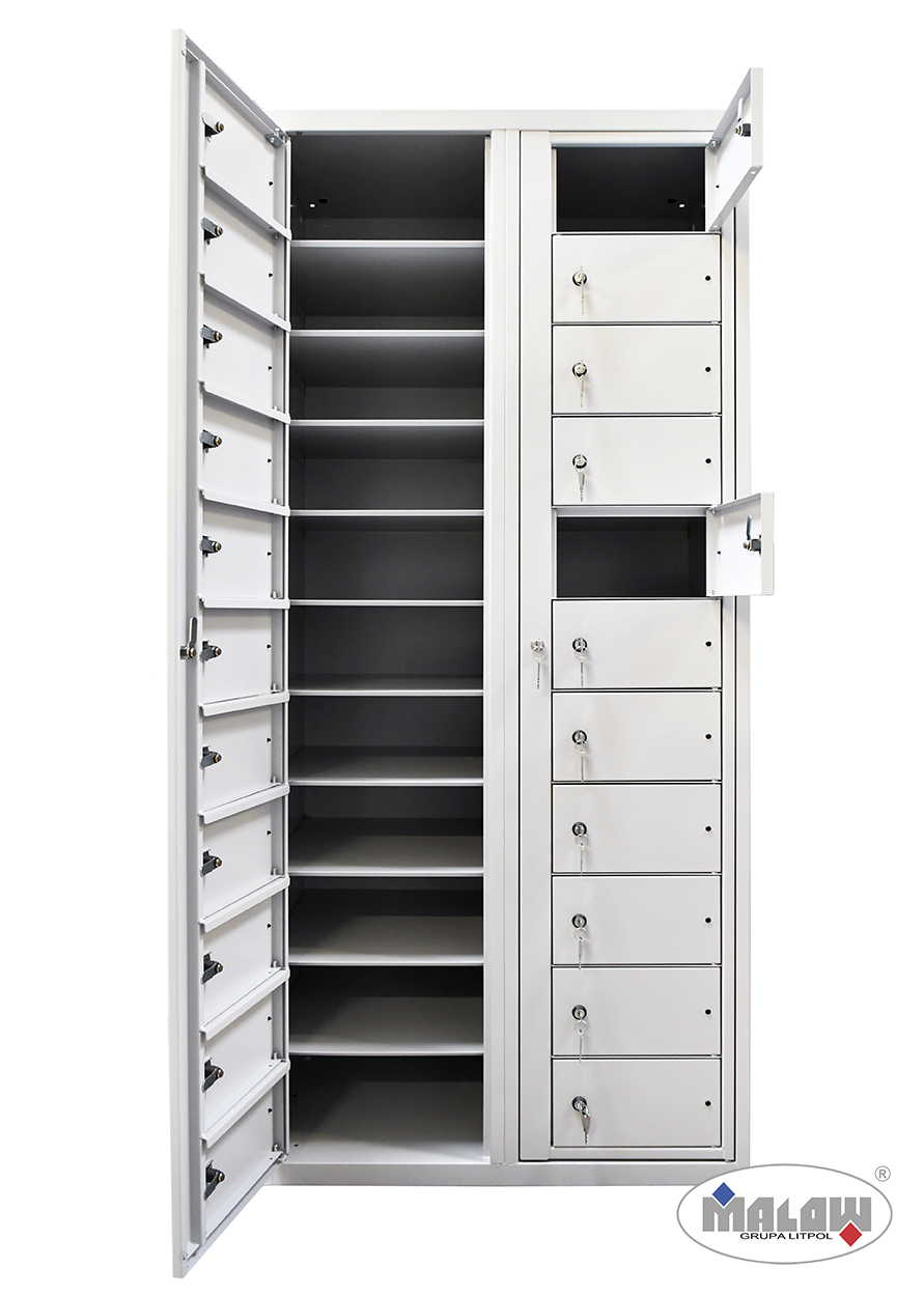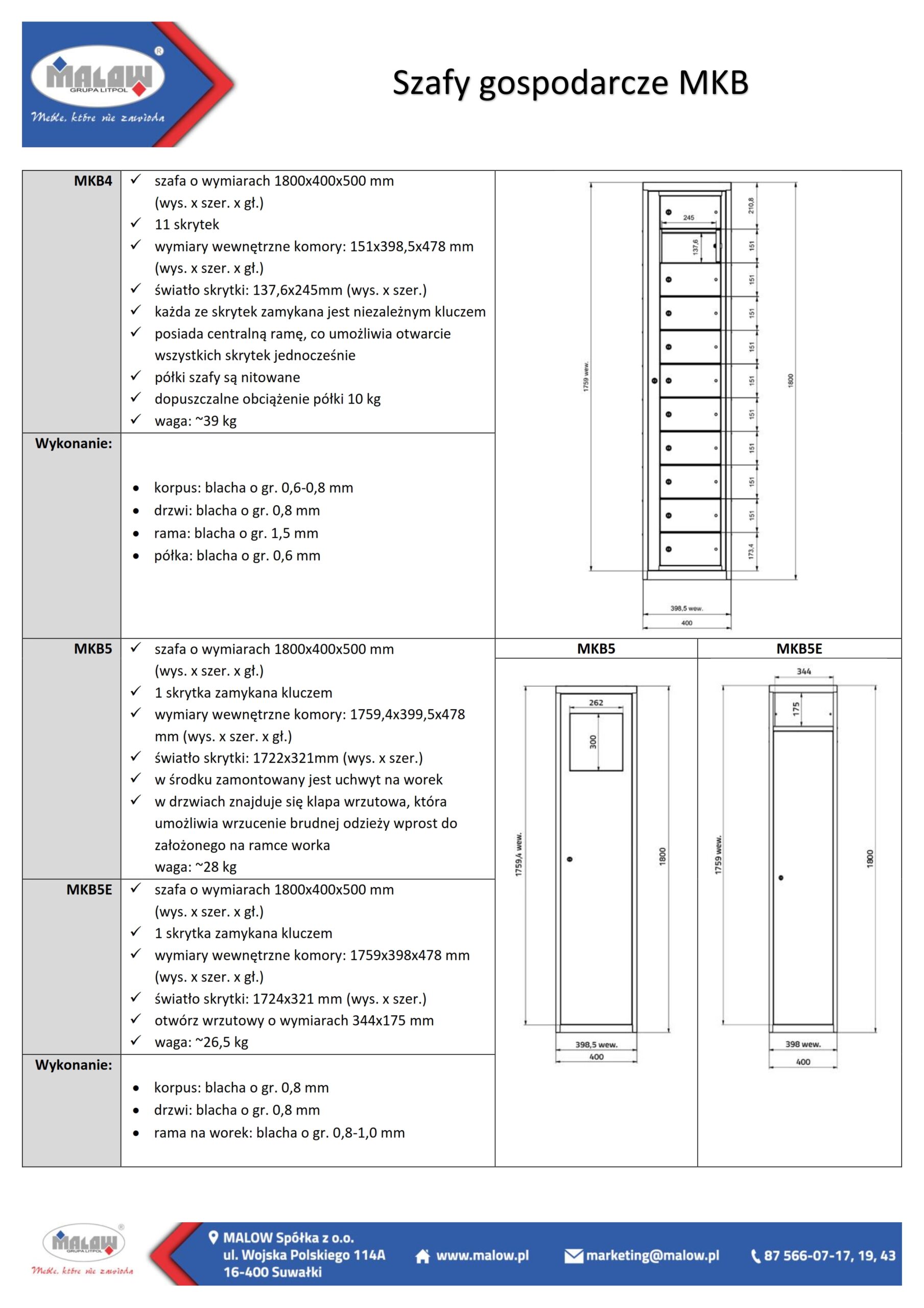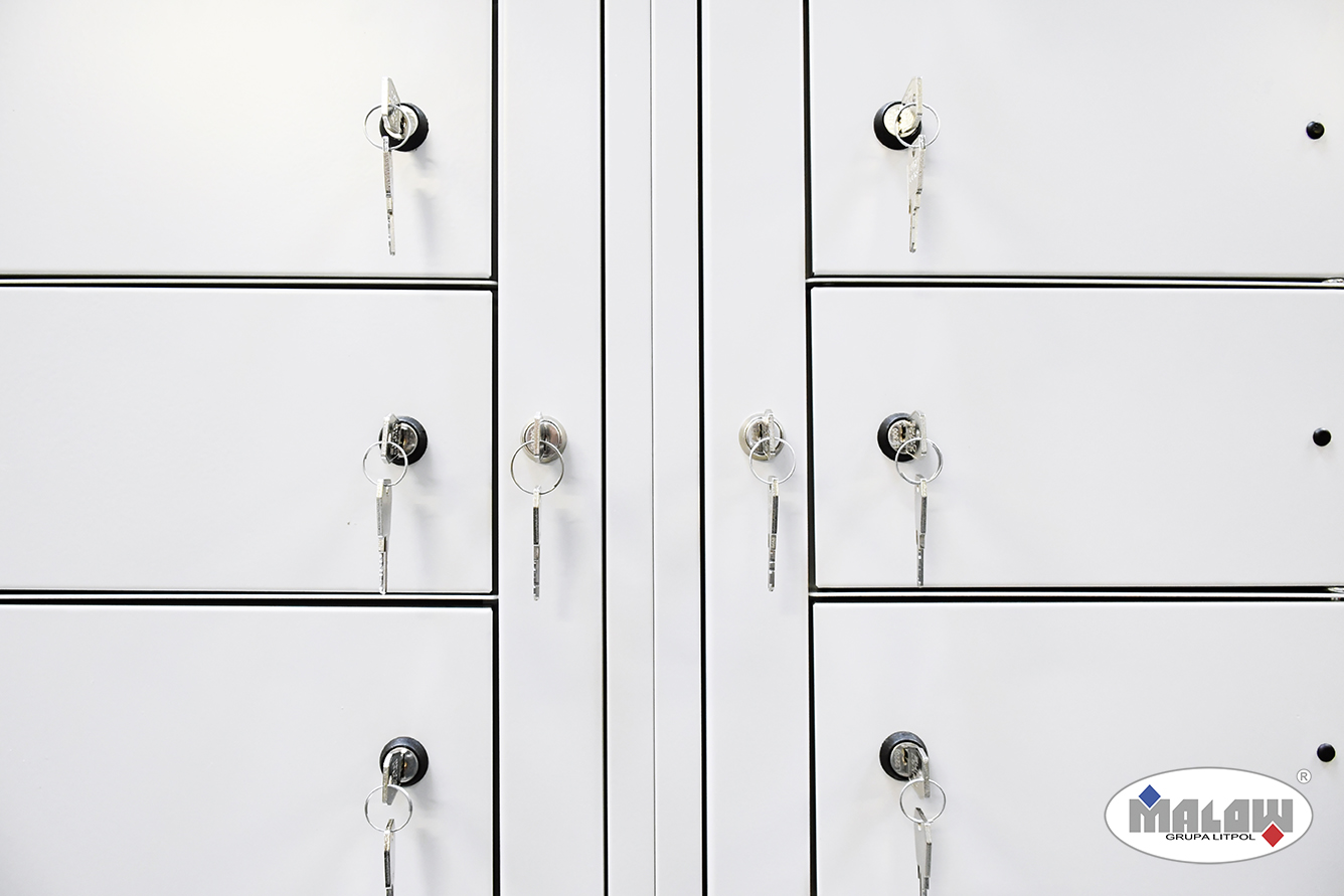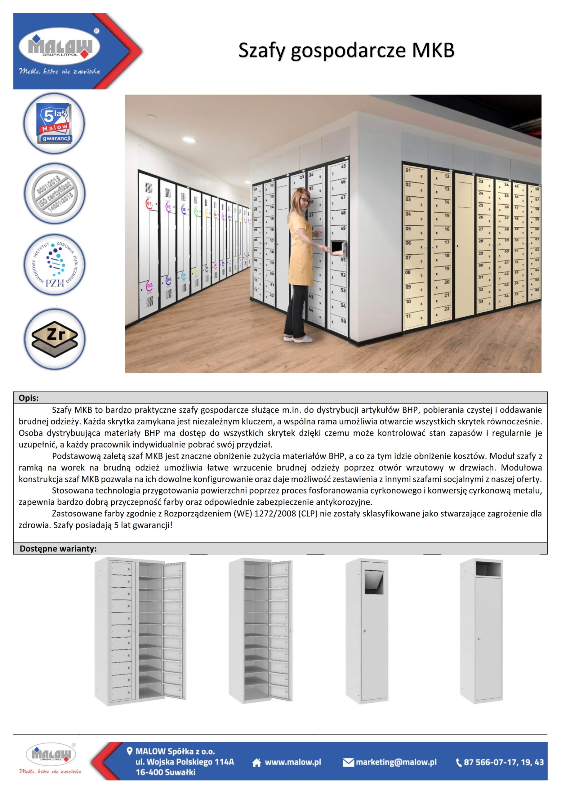 Szafy MKB to bardzo praktyczne szafy gospodarcze służące m.in. do dystrybucji artykułów BHP, pobierania czystej i oddawanie brudnej odzieży. Każda skrytka zamykana jest niezależnym kluczem, a wspólna rama umożliwia otwarcie wszystkich skrytek równocześnie. Osoba dystrybuująca materiały BHP ma dostęp do wszystkich skrytek dzięki czemu może kontrolować stan zapasów i regularnie je uzupełnić, a każdy pracownik indywidualnie pobrać swój przydział.