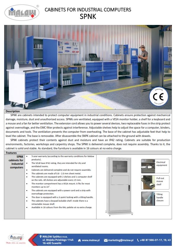 Our industrial computer cabinets have the IP42 rating. These high-quality products protect stored devices against harsh industrial conditions. SPNK cabinets fit to the majority of computers. The universal VESA mount allows to mount monitors up to 22”. As a standard, the cabinets have a power cord and overvoltage protection. You can learn more about SPNK cabinets from the catalogue card.